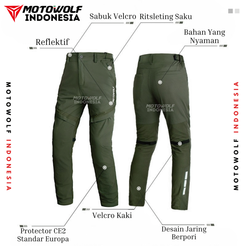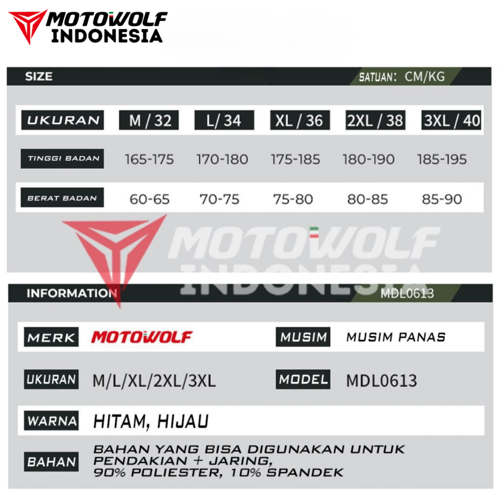 Desain celana 0613 adalah perpaduan dari beberapa model celana touring motowolf yang mana bagian depannya water repellent dan bagian belakangnya mesh (jaring) untuk memberikan sirkulasi udara sangat maksimal ketika riding dalam cuaca yang panas.