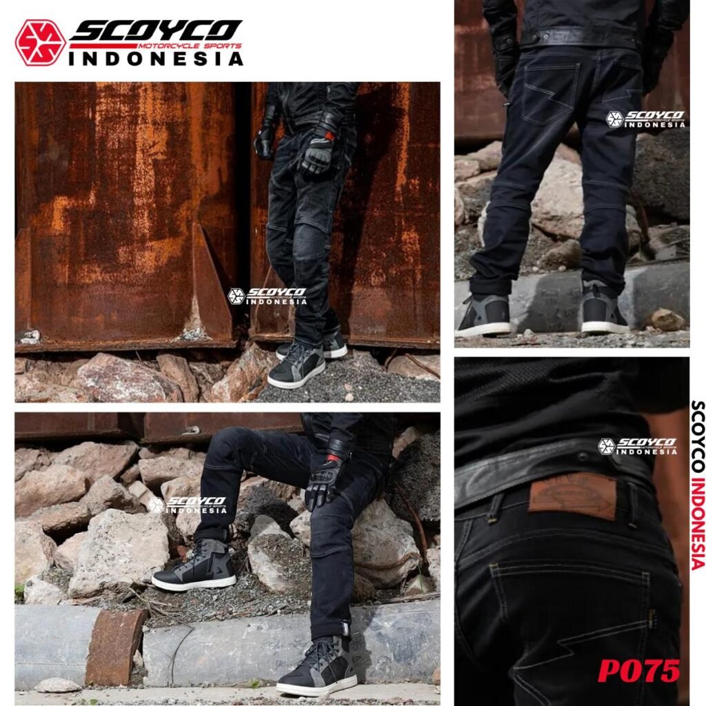 Celana Riding, Touring, Sunmori dengan model celana jeans. Stylish namun tetap mengutamakan aspek keselamatan berkendara dengan tambahan protektor dan paduan bahan yang nyaman ketika dipakai.