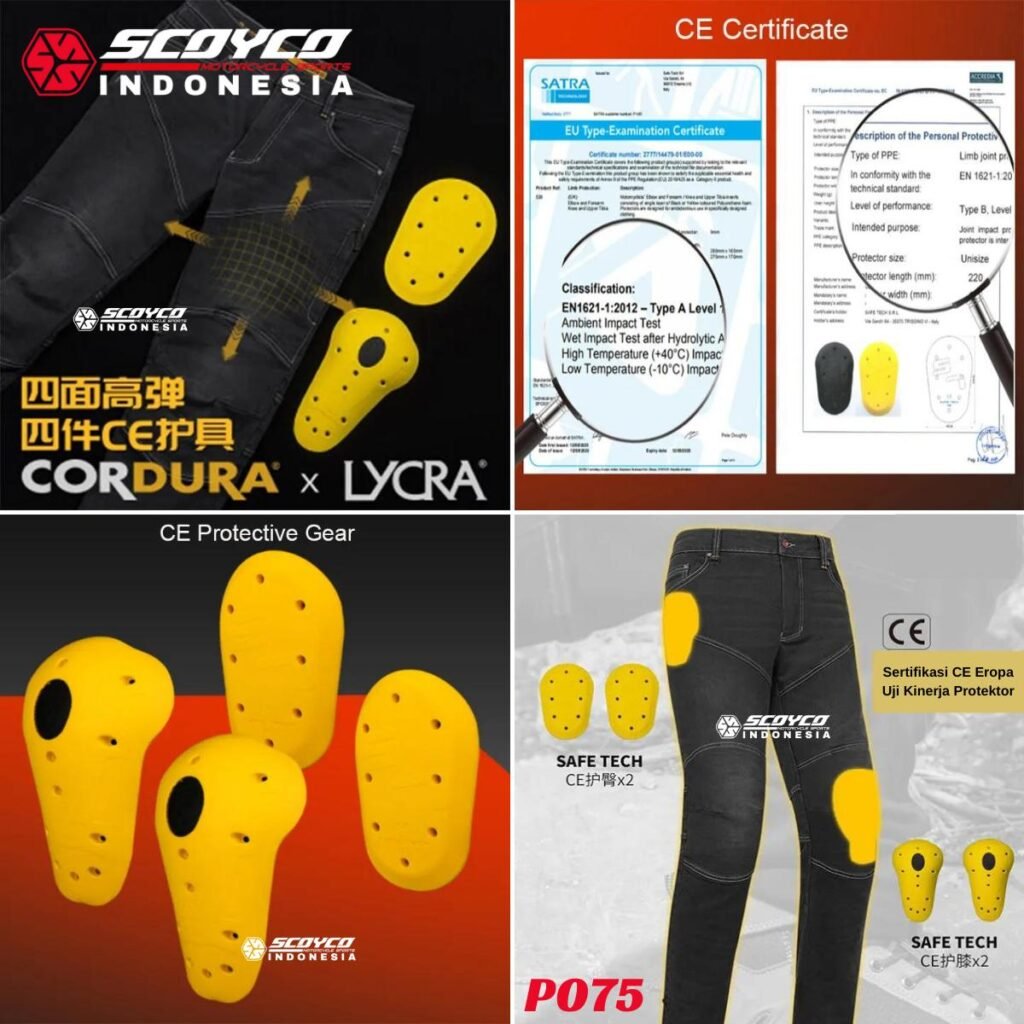 Celana ini dilengkapi dengan 2 pelindung pinggul dan 2 pelindung lutut bersertifikat CE (Certified Europe) yang berstandar Eropa dan dipasarkan di Eropa. Pelindung ini bisa dilepas-pasang sesuai kebutuhan.