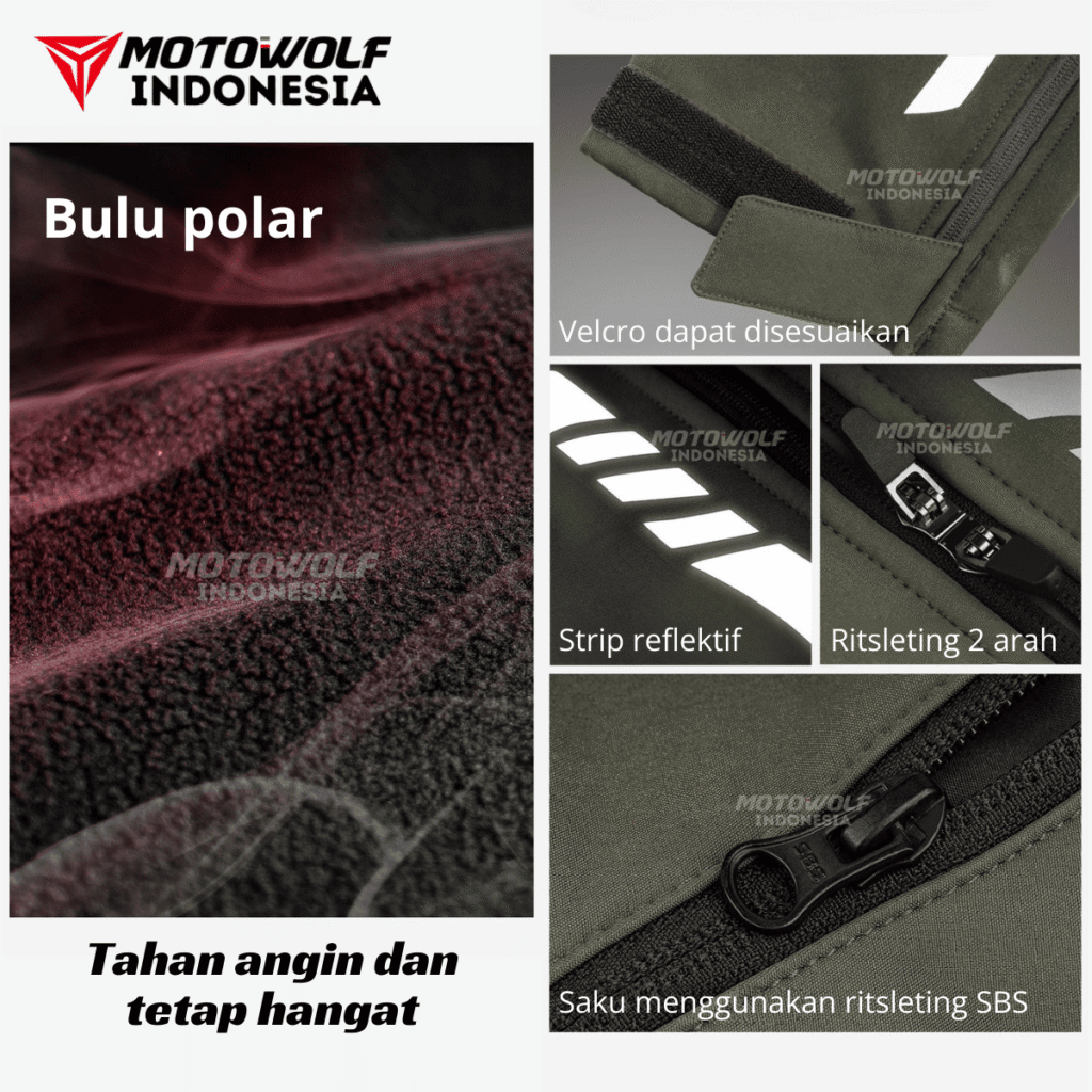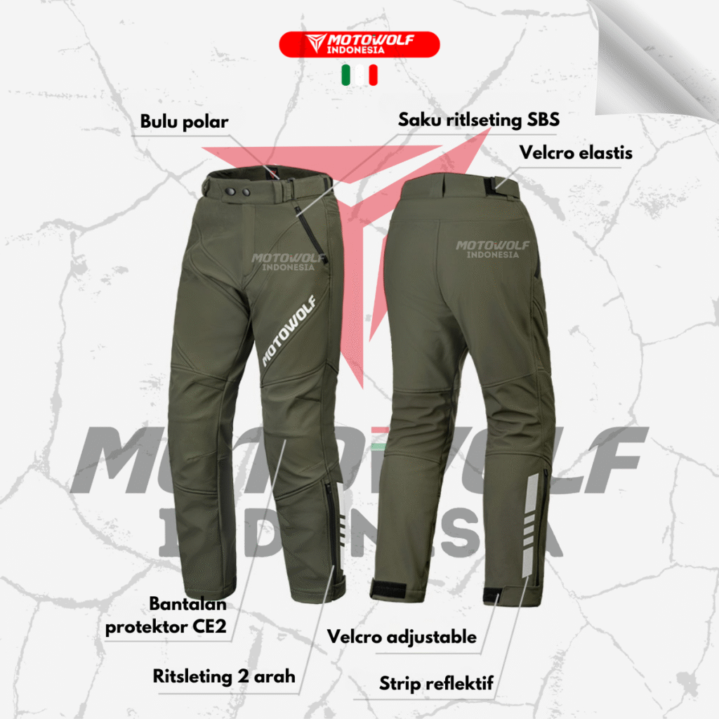 Fitur : Bantalan Protector CE2, Velcro Adjustable Bawah, Strip Reflektif, Saku Ritsleting, Ritsleting 2 Arah Bagian Samping, Bagian Pinggang Velcro penyesuaiaan, Bagian Dalam Terdapat Bahan Bulu Polar Yang Lembut Dan Nyaman Saat Digunakan, Hangat, Anti Angin.