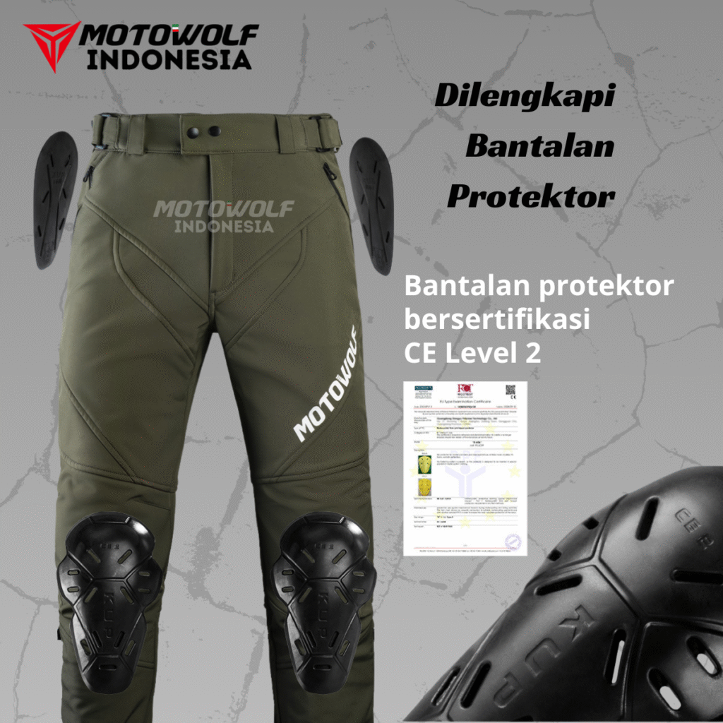 Celana ini juga dilengkapi dengan 4 Protector berbahan EVA yang terkenal empuk, awet dan tahan lama dan sudah Bersertifikat Euro level 2 yang sudah teruji ketahanannya.