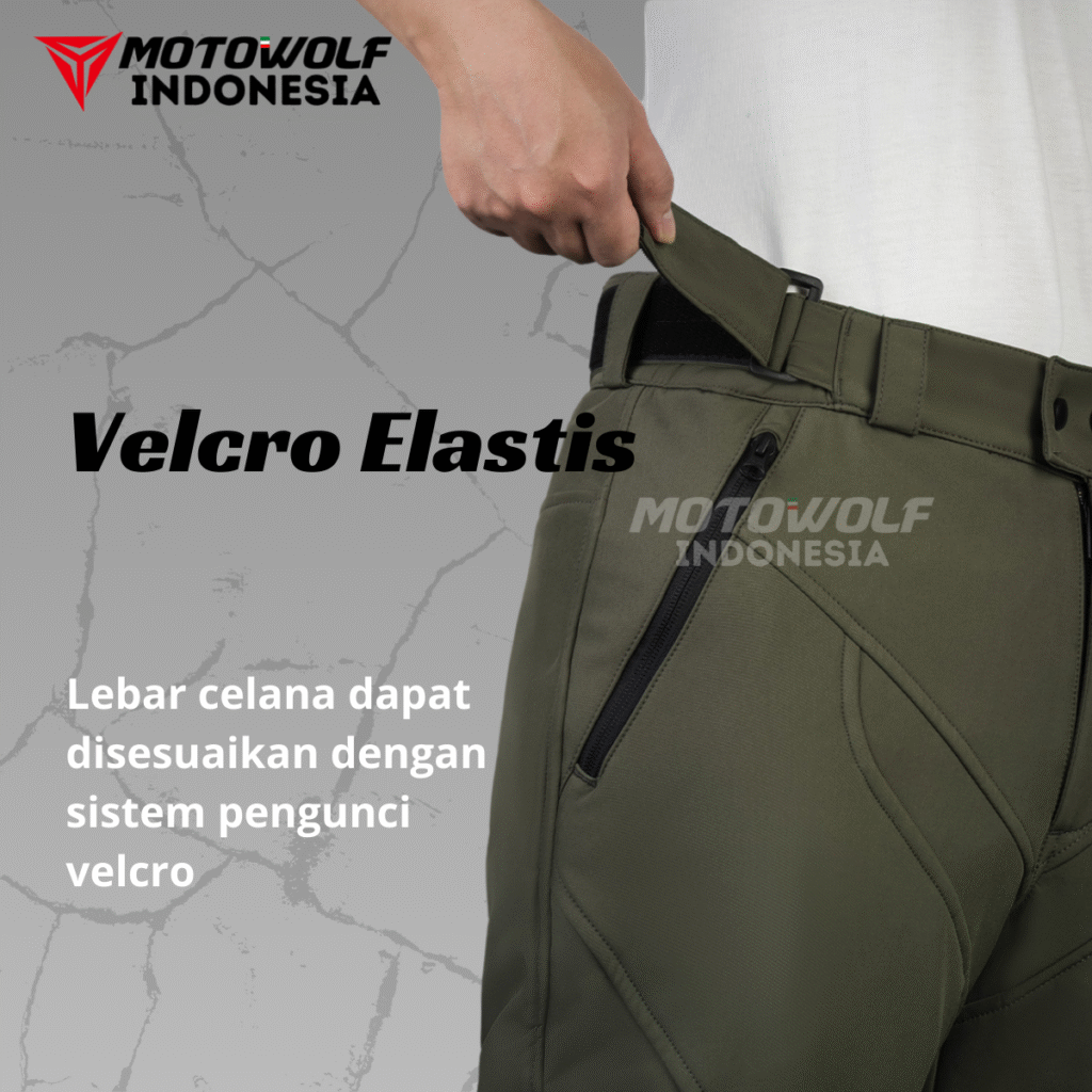 Bagian pinggang celana ini juga dilengkapi tali velcro sebagai setelan yang nyaman dan mudah untuk menyesuaikan ukuran, serta double lock pada tengah.