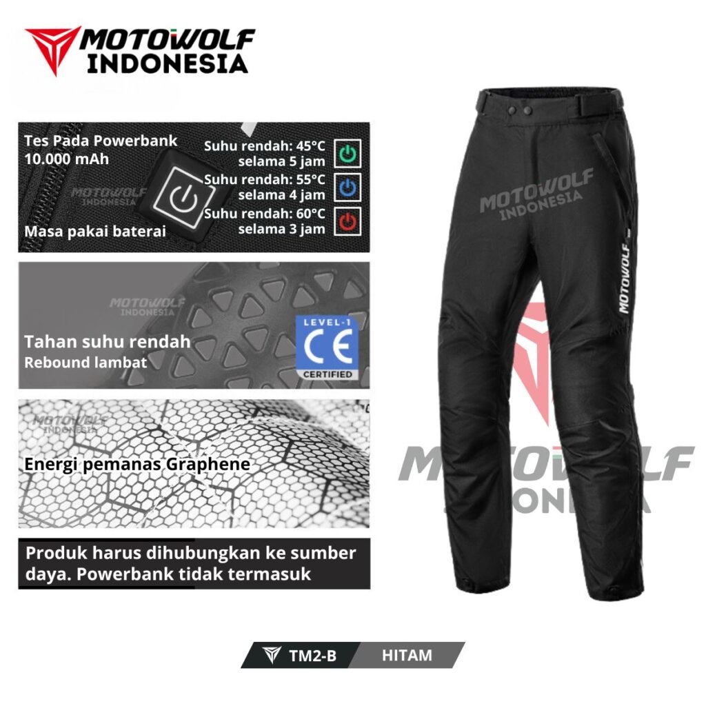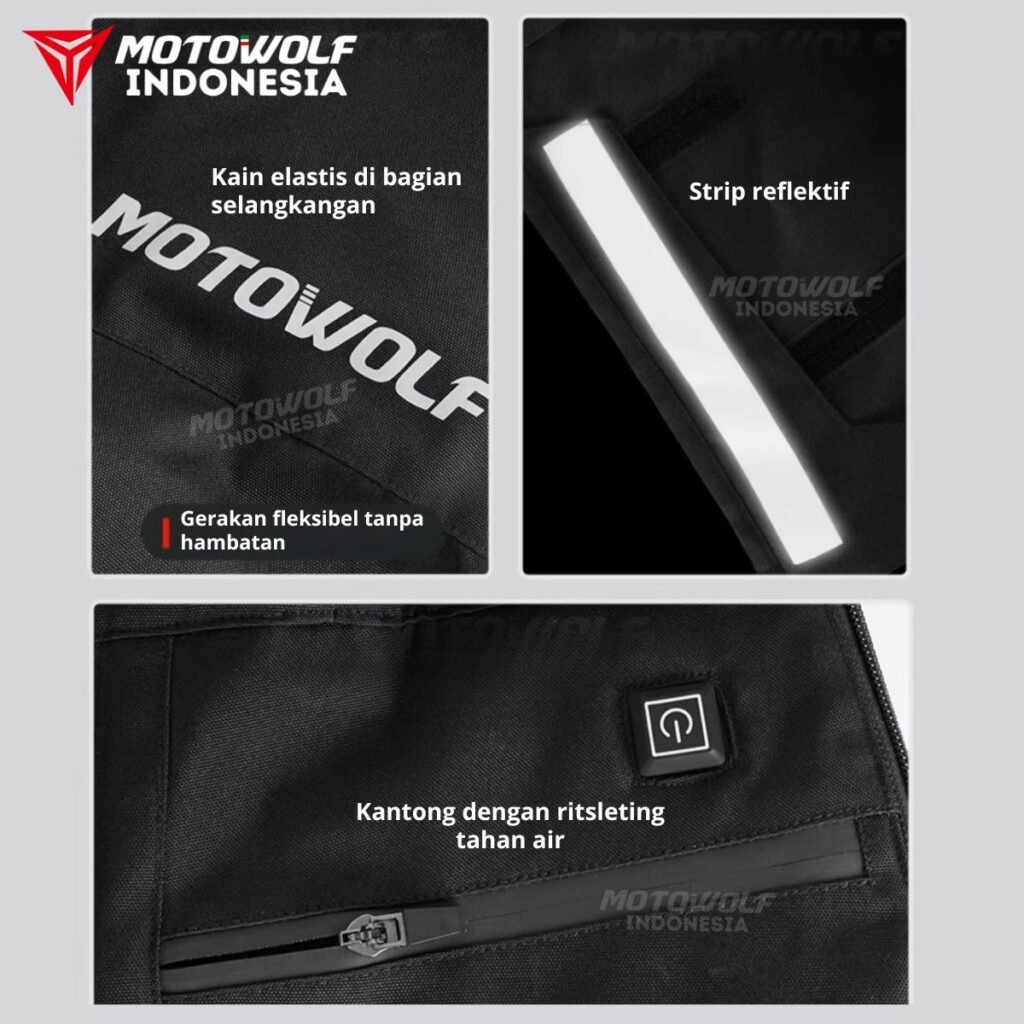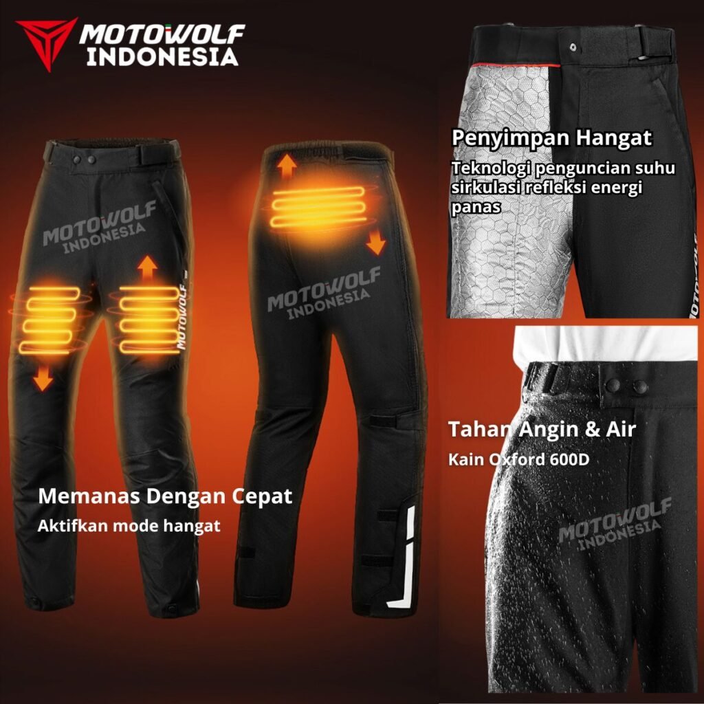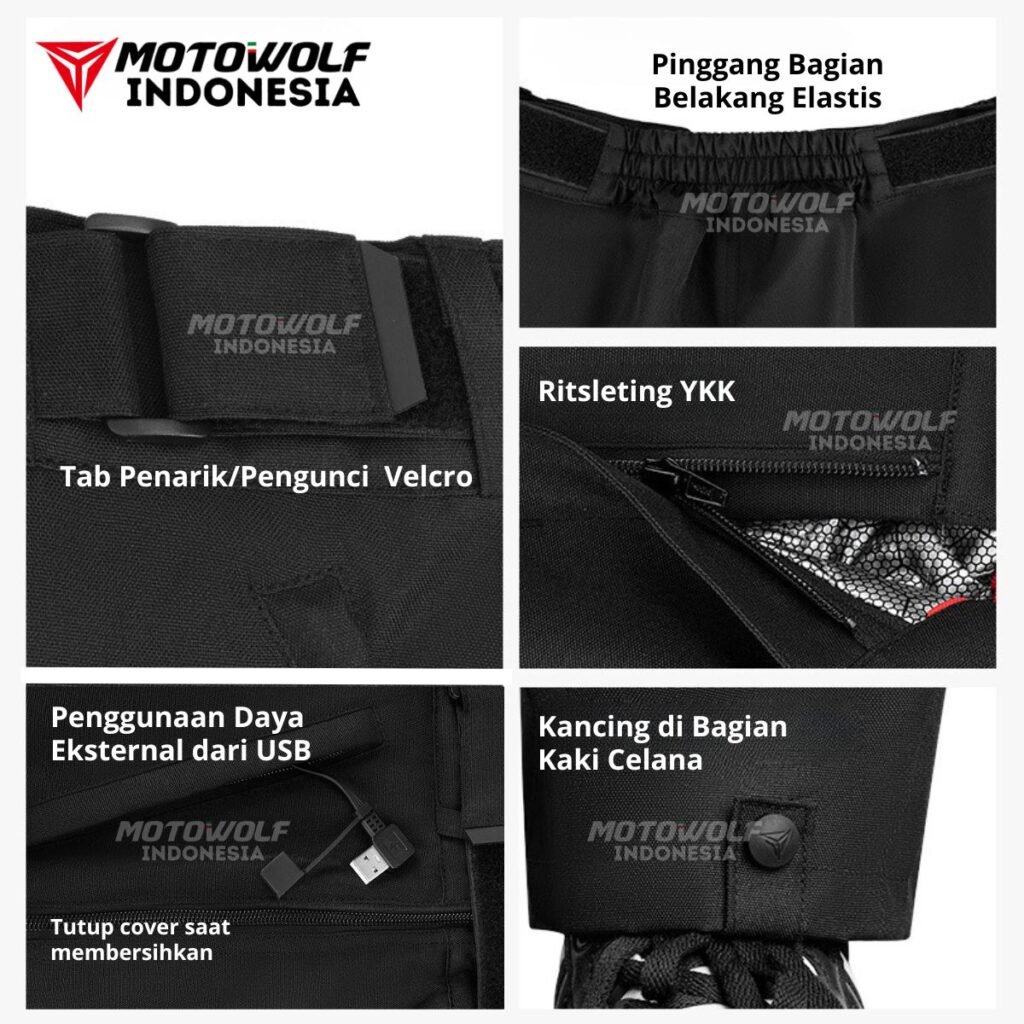 Fitur : Bantalan Protector CE1, Strip Reflektif, Ritsleting 2 Arah Bagian Samping, Bagian Pinggang Velcro Penyesuaiaan, Terdapat Electrik Heat Untuk Pemanas, Anti Angin, Kancing Pada Kaki Celana, Velcro Reflektif, Ritsleting YKK, Pinggang Bagian Belakang Elastis, Kain Elastis Pada Bagian Selangkangan.