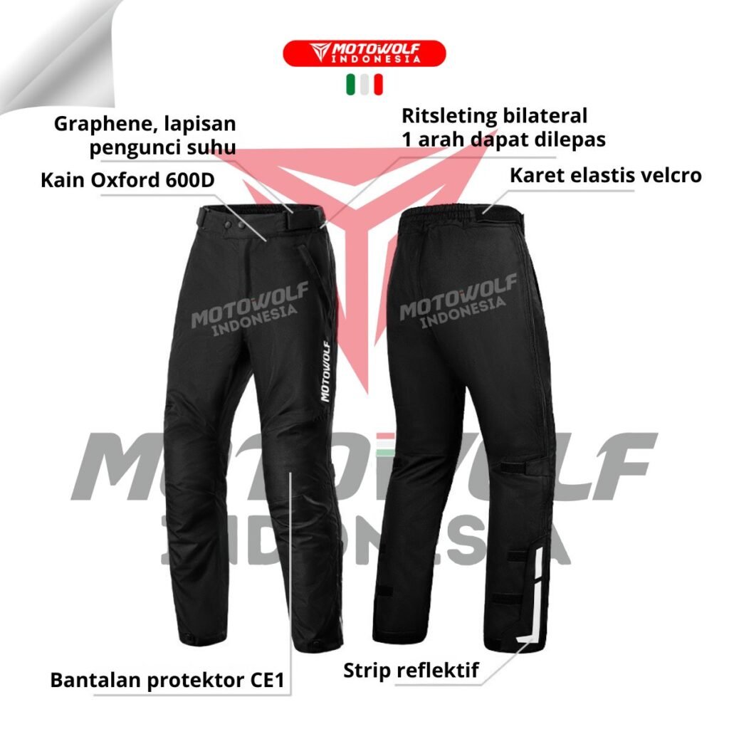 Celana ini juga dilengkapi stiker reflektif pada bagian bawah samping, velcro samping, sebagai fitur tambahan keamanan saat dipakai di malam hari.