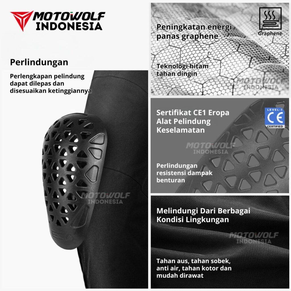Dilengkapi 2 pelindung dengan material yang sudah diakui oleh standar Eropa (CE – Certified Europe) dengan grade CE1 pada bagian lutut yang bisa dilepas-pasang sesuai kebutuhan.