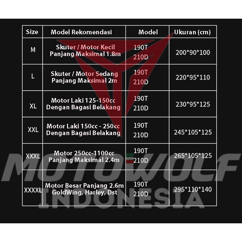 Cover motor ini dapat digunakan untuk anti air hujan, anti panas dan mengurangi debu yang menempel pada motor.