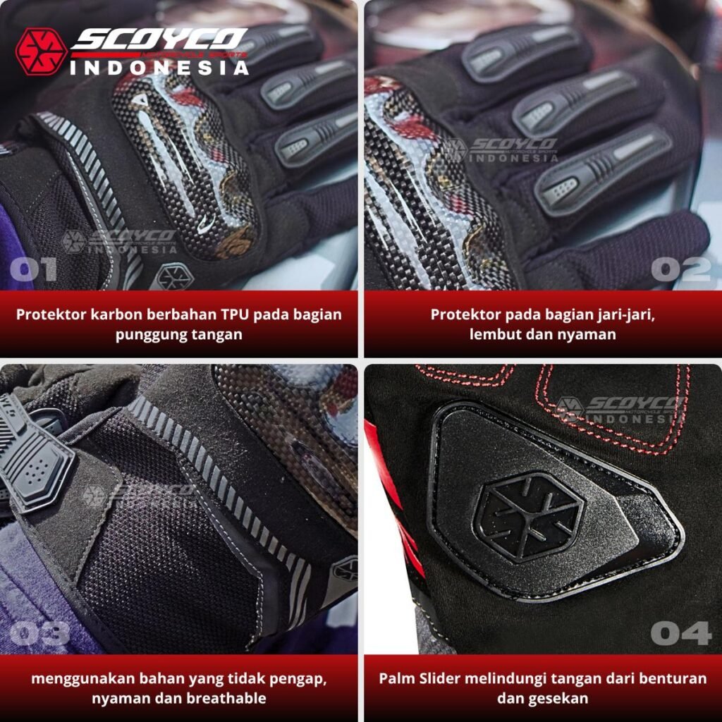 Fitur : Cangkang Pelindung Karbon TPU, Pelindung PVC, Pengunci Velcro, Kain Berventilasi, Touchscreen, Palm Slider, Bantalan Pada Bagian Telapak.