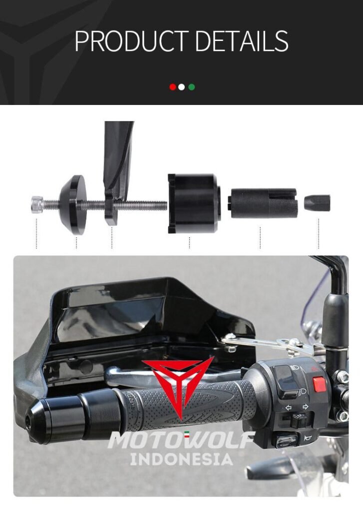 Pemasangan pada motor, lepas stabilizer ujung stang motor. Pasang handguard dan setel jarak dengan dudukan yang menempel pada baut spion atau modifikasi.