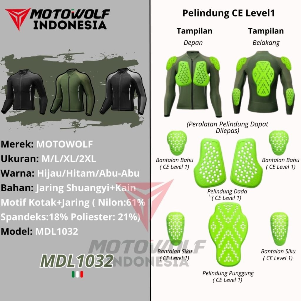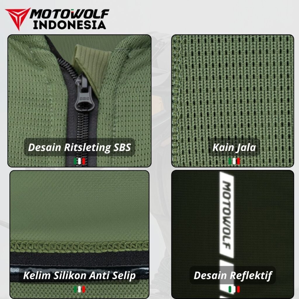 Fitur : Protector Pelindung Bersertifikat CE Level 1, Strip Reflektif, Ritsleting SBS, Kain Silikon Anti Selip