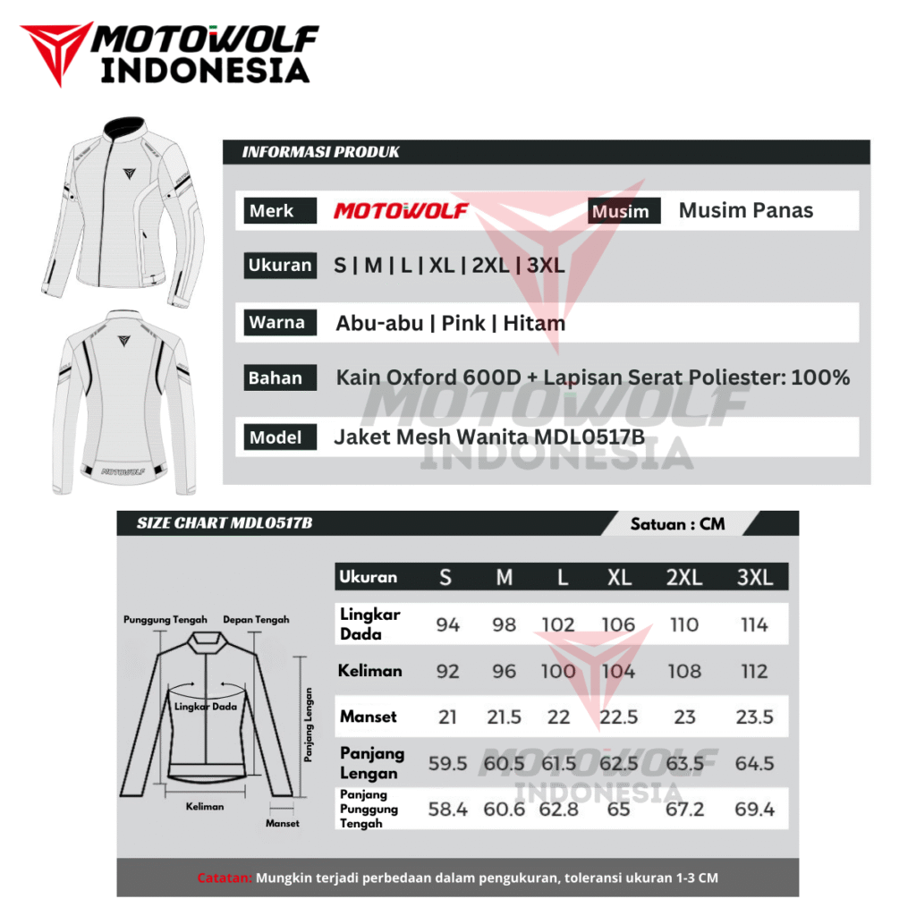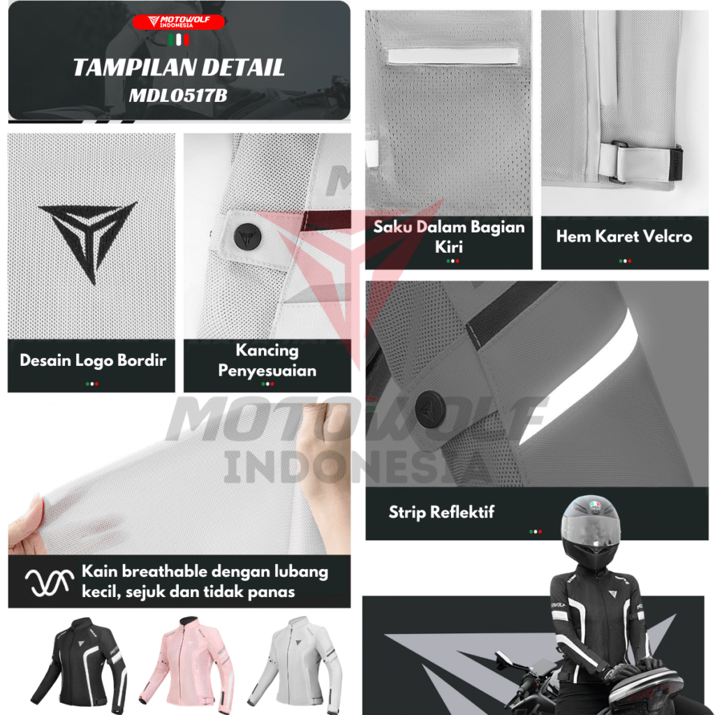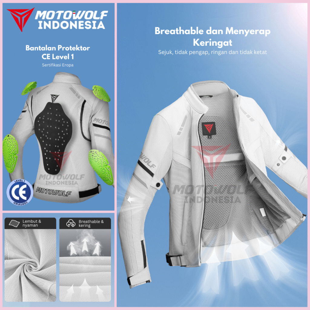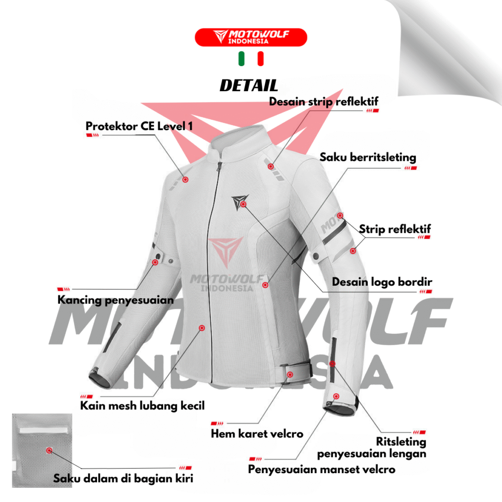 Fitur : Protector, Mesh, Double Furing, Reflektif Di Malam Hari, Resleting Saku, Penyambungan Jaring Berpori, Setelan Pinggang dan lengan.