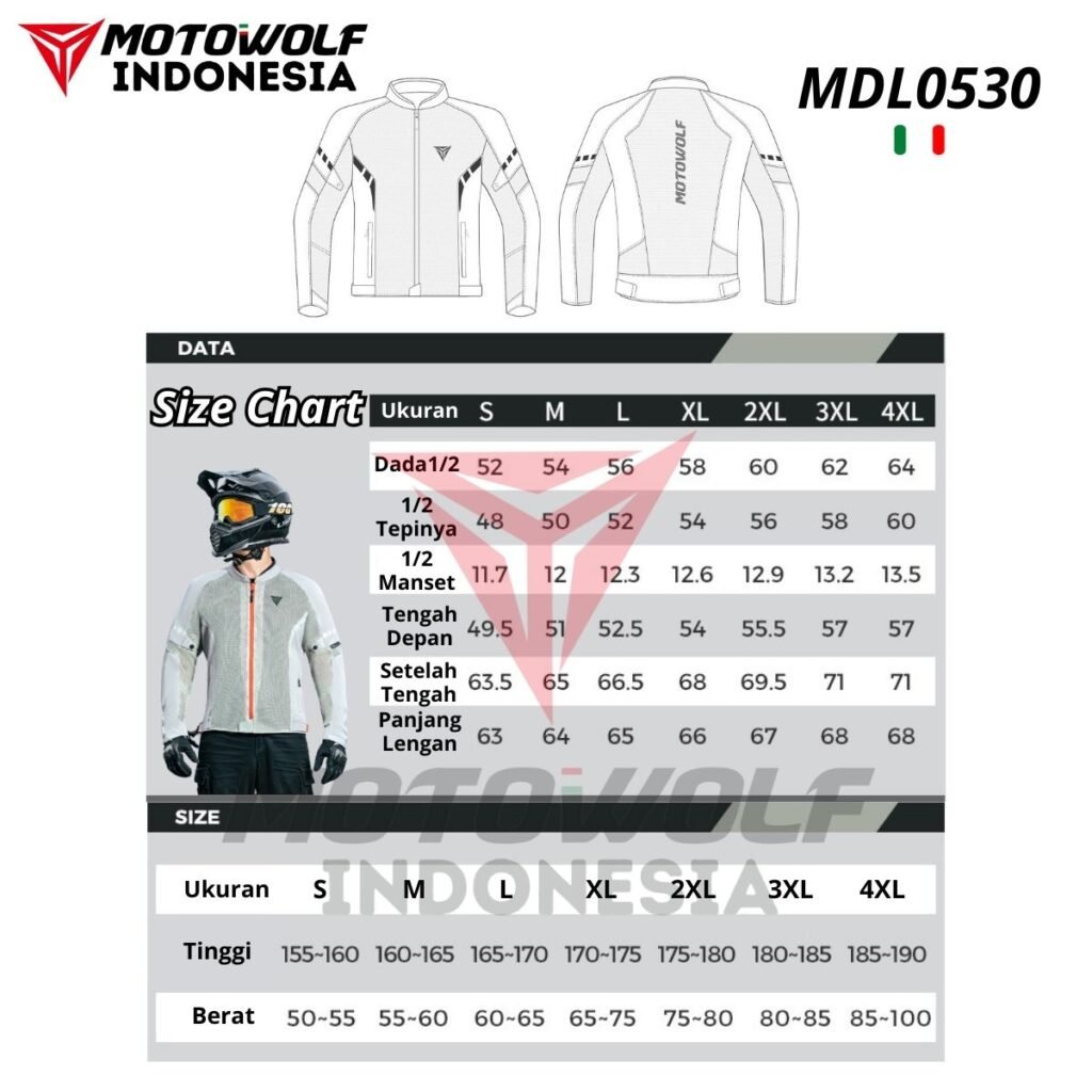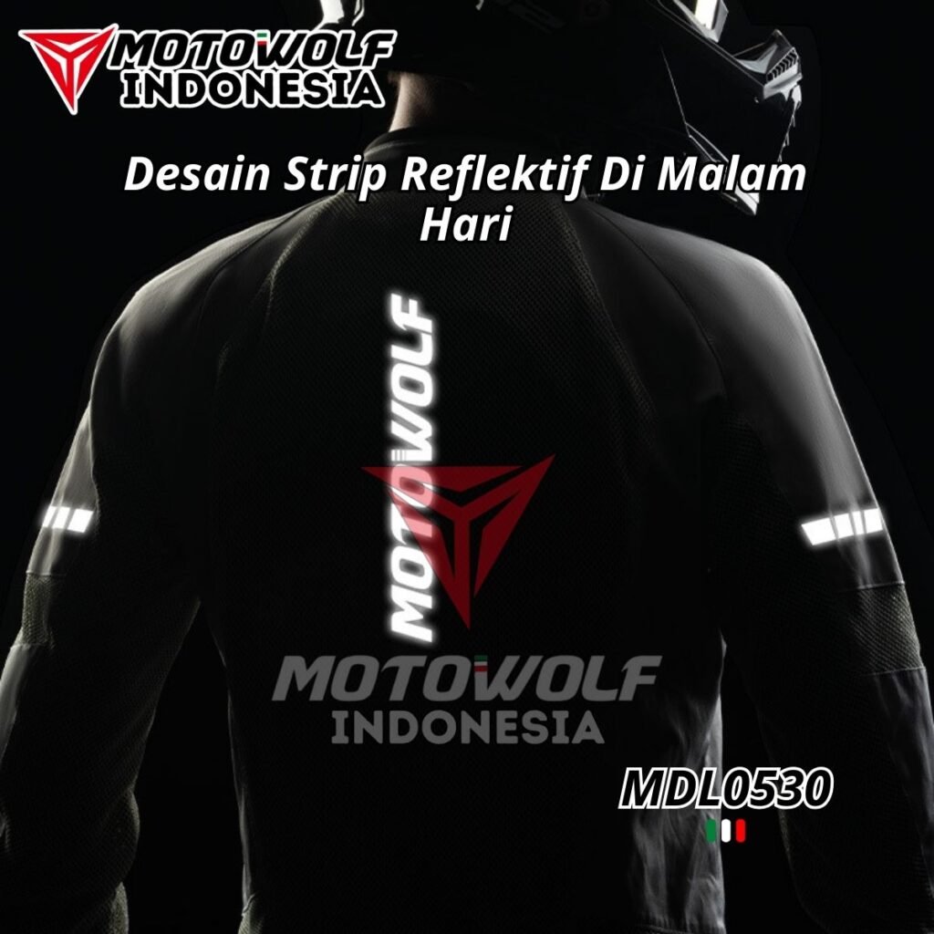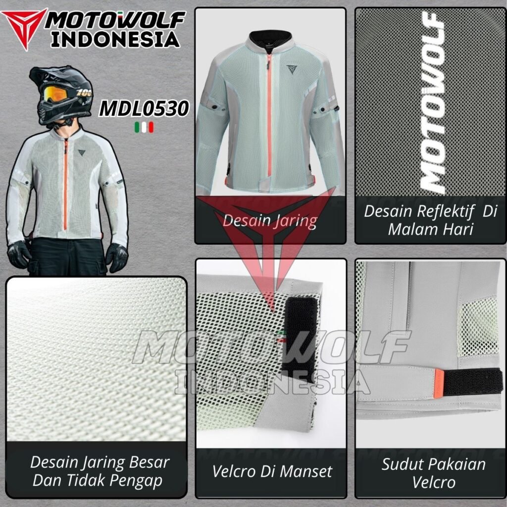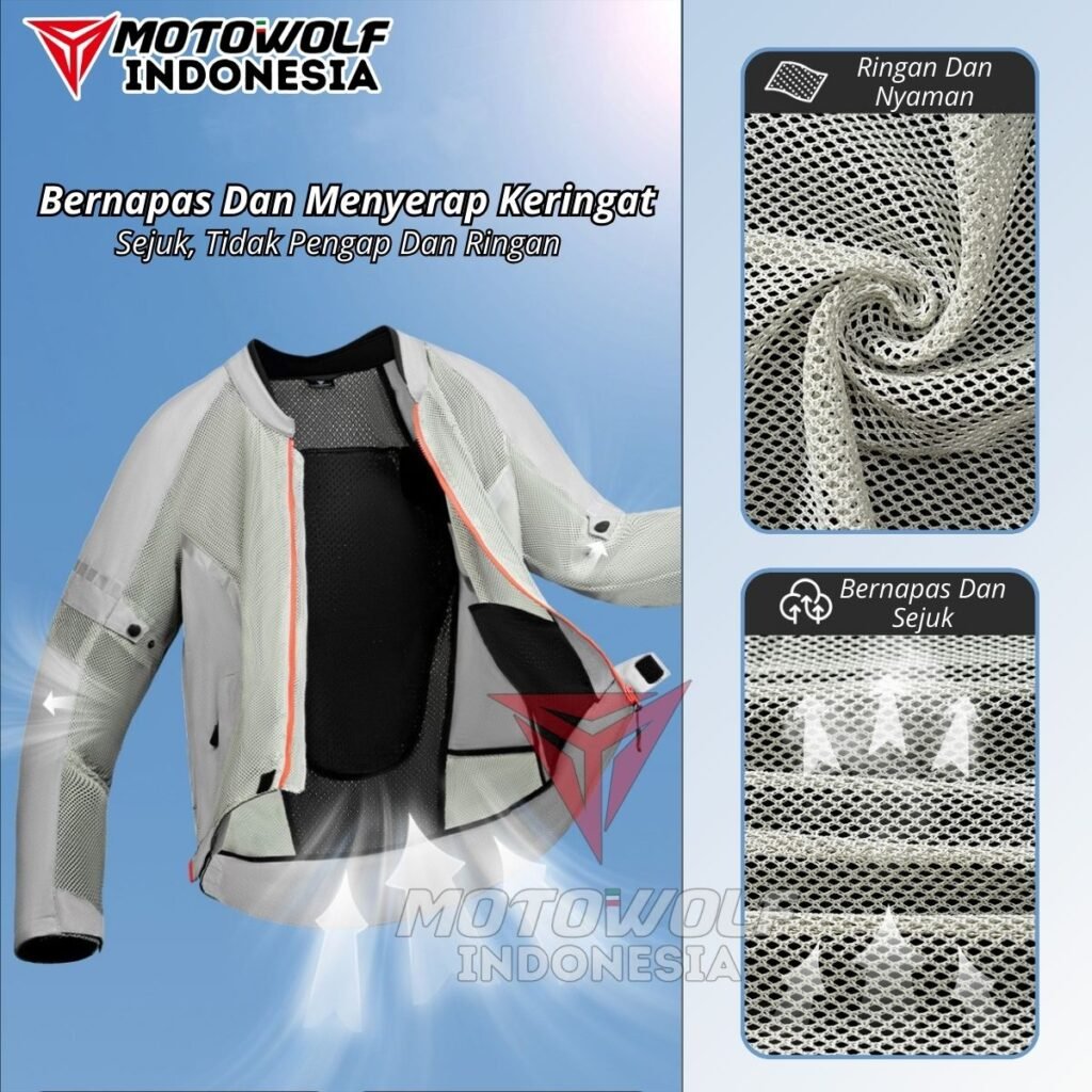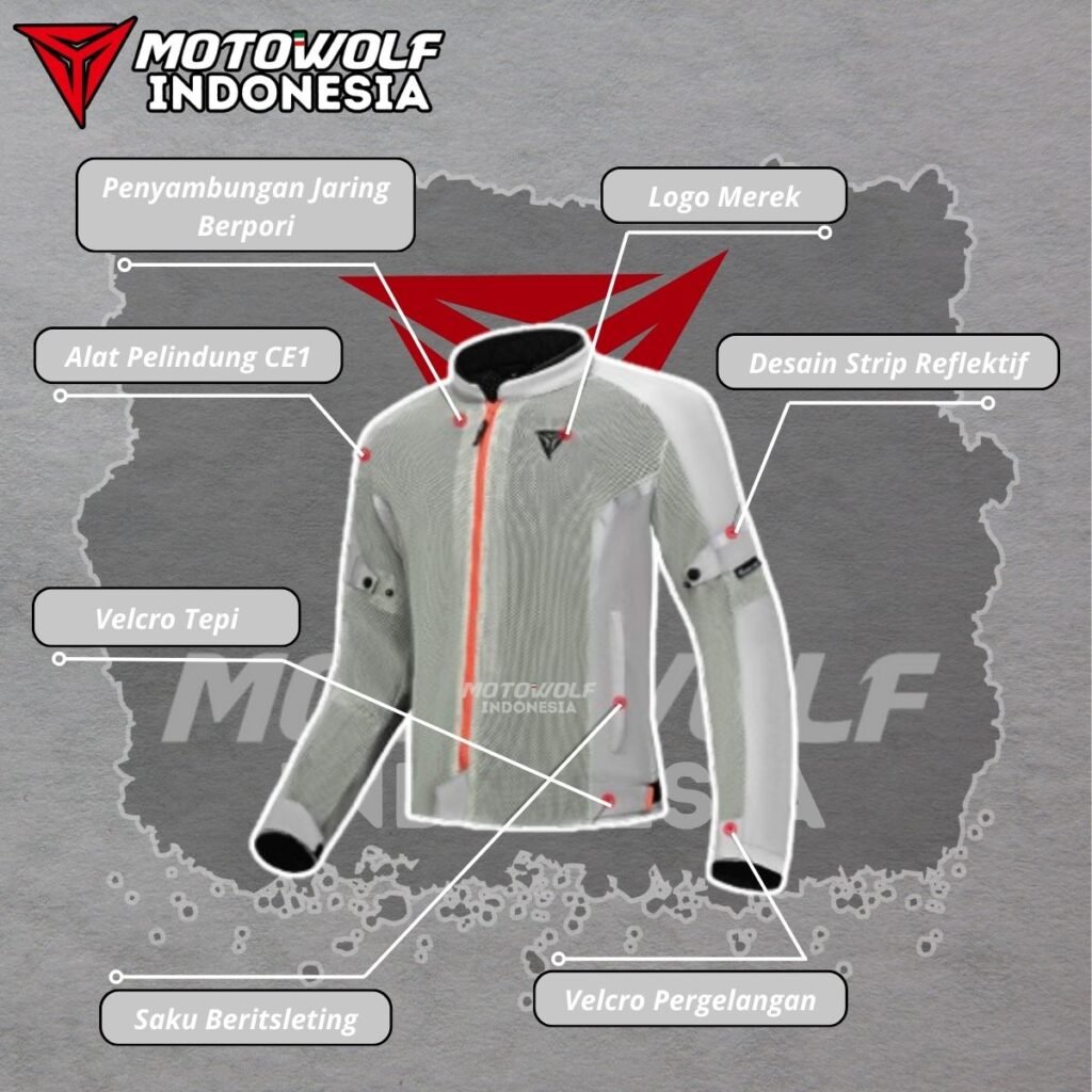 Fitur : Protector, Mesh, Double Furing, Reflektif Di Malam Hari, Resleting Saku, Penyambungan Jaring Berpori.