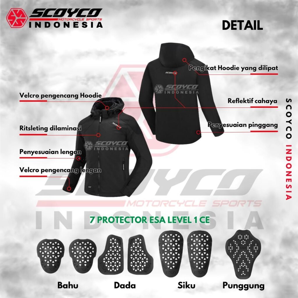 Jaket ini memiliki 7 bantalan pelindung/protektor merek ESA yang sudah diakui oleh standar Uni Eropa (CE) dengan masing-masing 1 pelindung di bagian punggung, 2 pelindung bagian dada, 2 pelindung pada bagian siku dan 2 pelindung pada bagian bahu yang kesemuanya bisa dilepas-pasang.