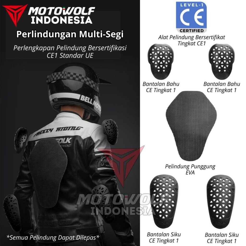 Jaket ini juga dilengkapi dengan 5 Protector berbahan EVA dengan sertifikat CE (Sertifikat Eropa) bermerk ESA yang terkenal sebagai brand protector terbaik dunia memiliki sifat bahan empuk, tahan benturan hingga lv1, ringan, awet dan tahan lama.
