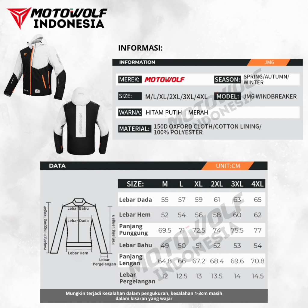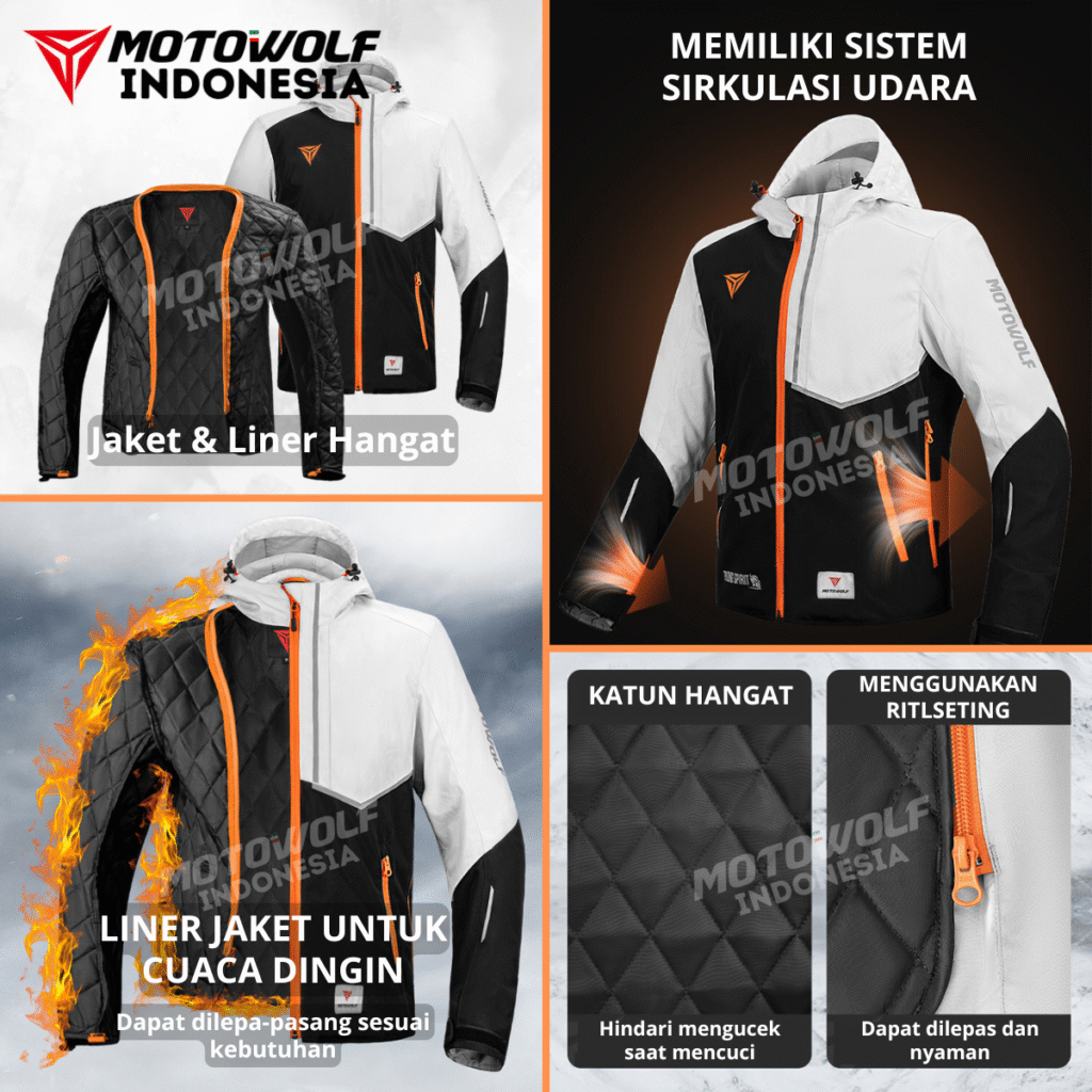 Motowolf Windbreaker Jacket JM6 memiliki lapisan dalam atau liner yang didesain untuk memberikan kehangatan ekstra disaat perjalanan malam ataupun cuaca dingin. Liner Penghangat ini bisa dilepas atau dipasang sesuai kebutuhan saat berkendara.
