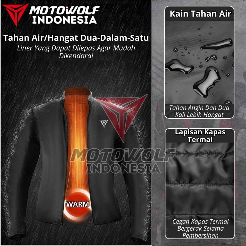 Motowolf Jacket JM8 memiliki lapisan dalam atau liner yang didesain untuk memberikan kehangatan ekstra disaat perjalanan malam ataupun cuaca dingin. Liner Penghangat ini bisa dilepas atau dipasang sesuai kebutuhan saat berkendara.