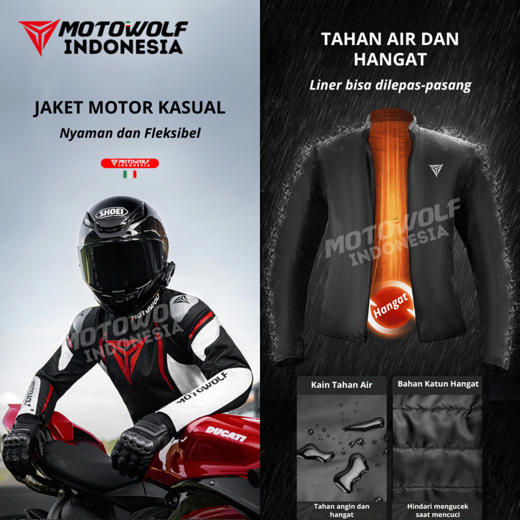 Motowolf Jacket JM9 memiliki lapisan dalam atau liner yang didesain untuk memberikan kehangatan ekstra disaat perjalanan malam ataupun cuaca dingin. Liner Penghangat ini bisa dilepas atau dipasang sesuai kebutuhan saat berkendara.