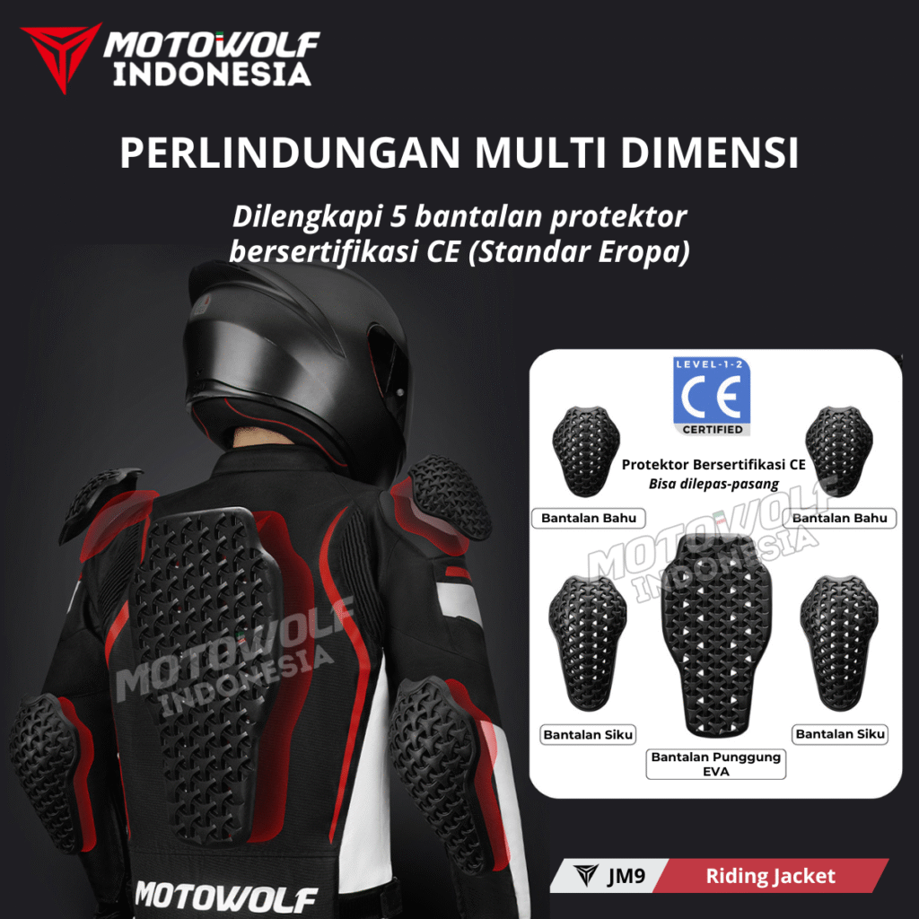 Jaket ini juga dilengkapi dengan 5 protektor yang sudah bersertifikasi CE (Sertifikasi Eropa)berbahan rubber yang empuk, awet dan tahan lama.
