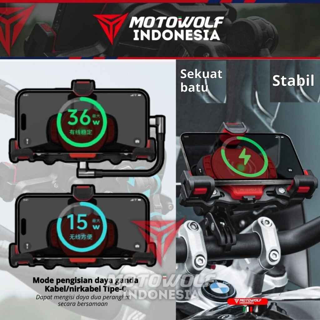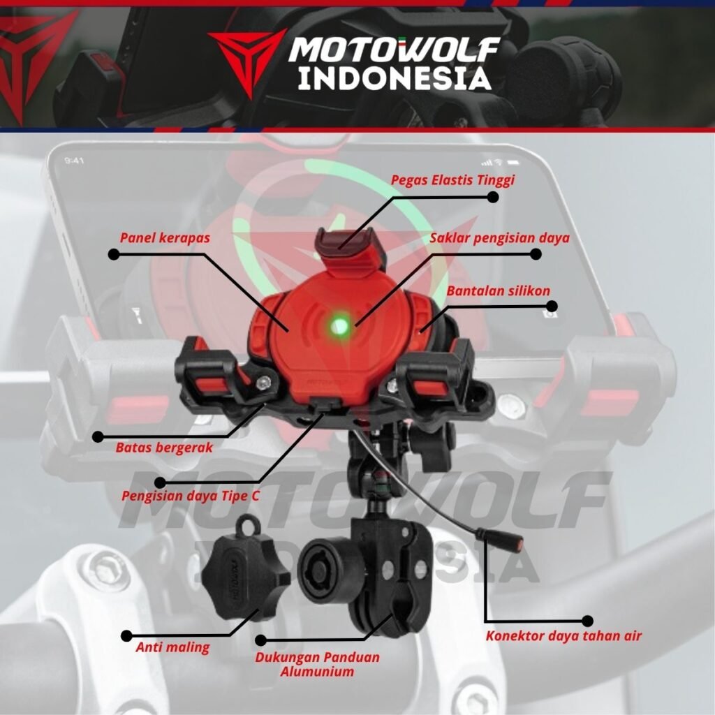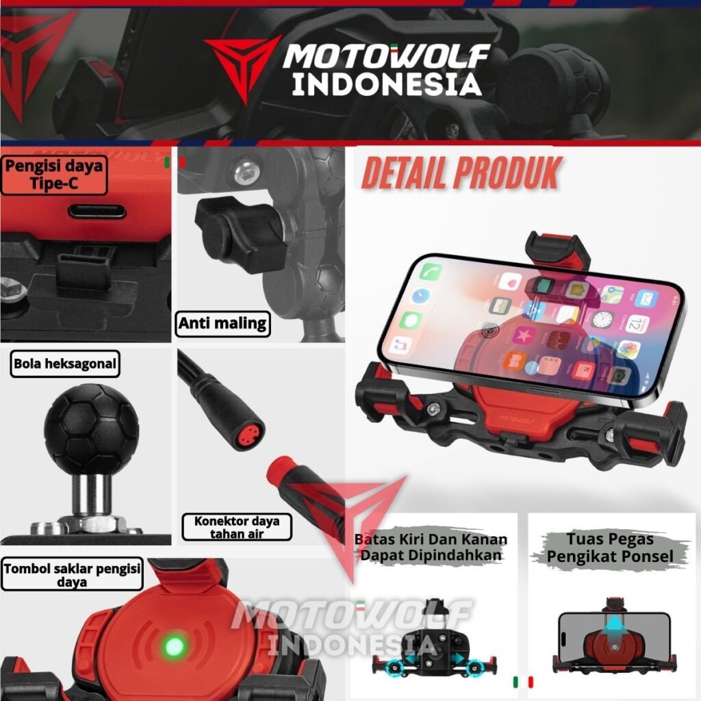 Fitur : Konektor Daya Tahan Air, Bantalan Silikon, Stabilizer, Anti Theft, 360°, Pengisian Daya Tipe C, Dapat Di Perluas Ke Samping, Pegas Elastis Atas, Dapat Mengisi Daya Dua Perangkat Secara Bersama.