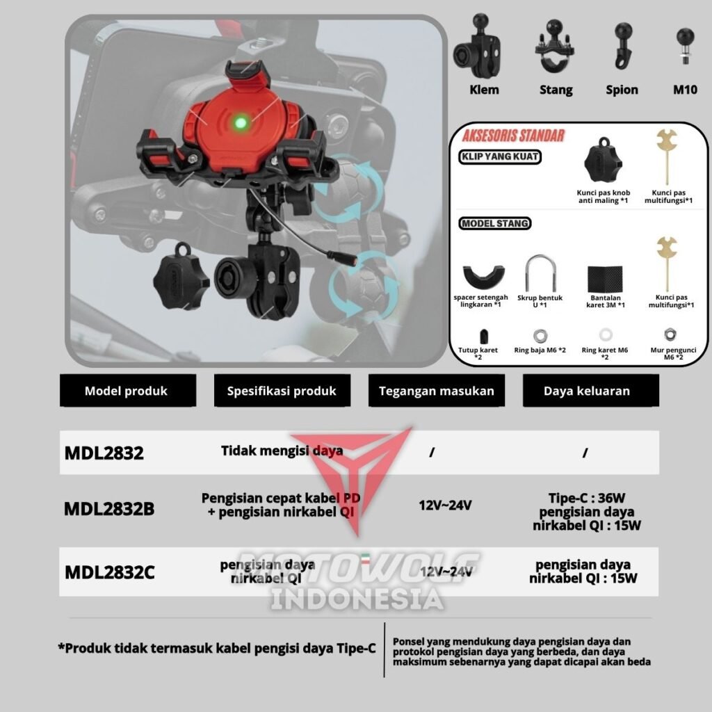2832B Stang, Spion Dan Baut : Phone Holder + Braket (Pilihan) + Jointer + Kunci Obeng + Wireless + USB Tipe C (Tidak Termasuk Pengisi Daya Tipe C)
