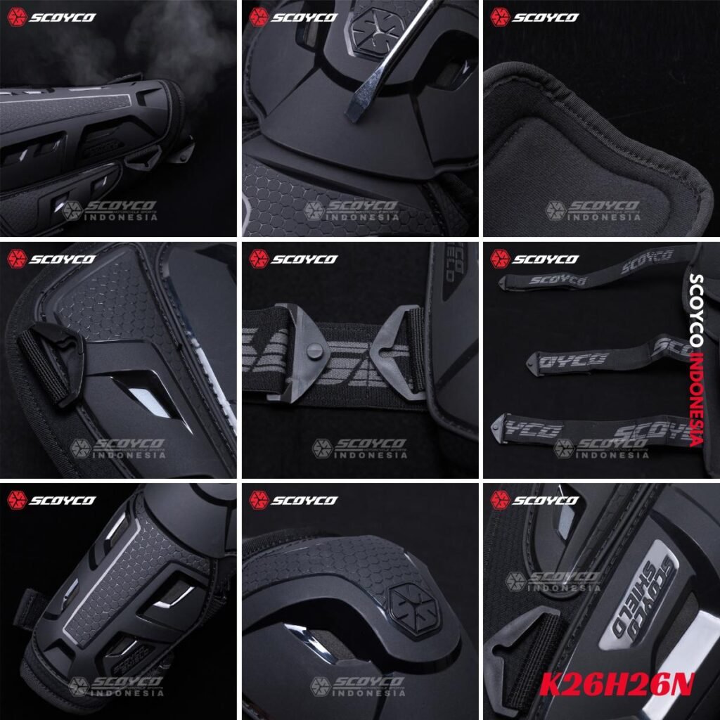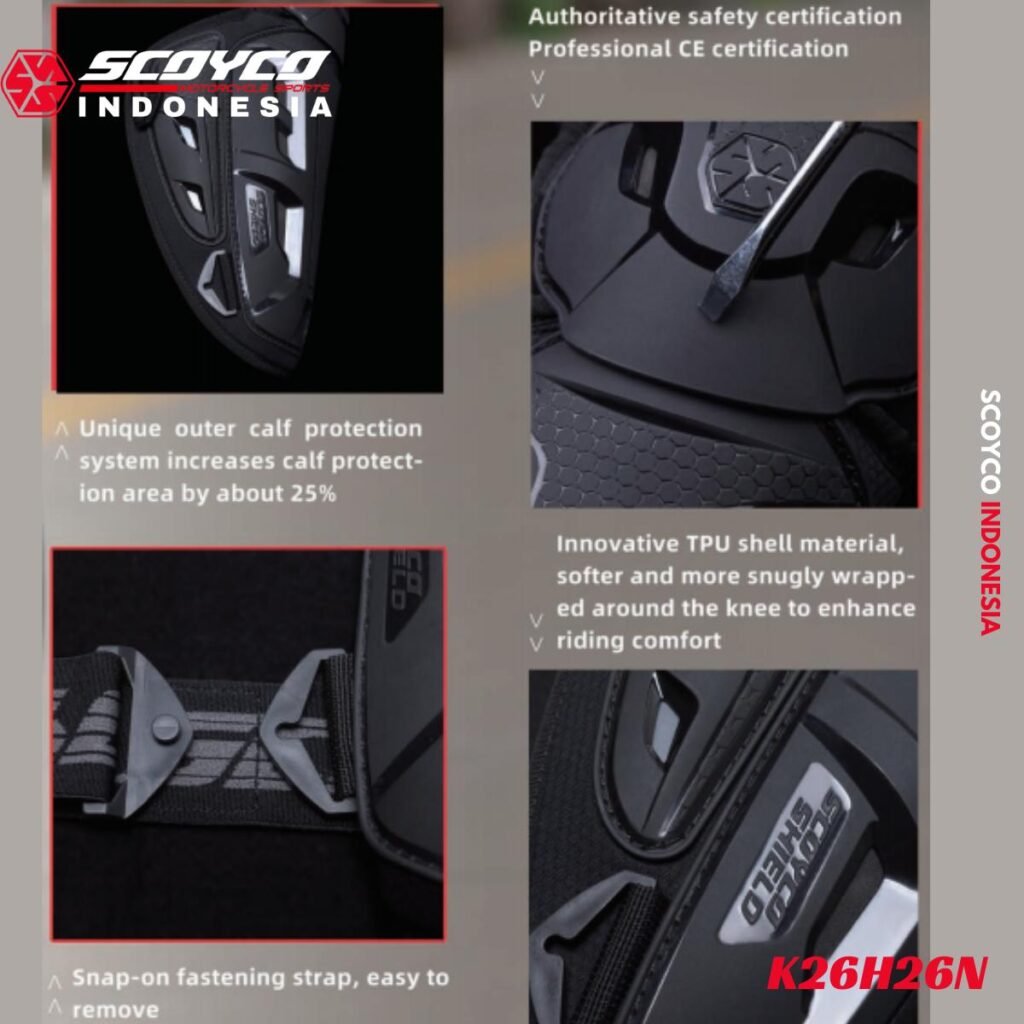 Strap pengikat yang mudah dilepas-pasang. Karet pengikat elastis dapat disesuaikan dengan bentuk celana yang digunakan saat berkendara. Terdapat busa yang meredam guncangan di dalam protektor yang dapat menahan efek benturan yang kuat.