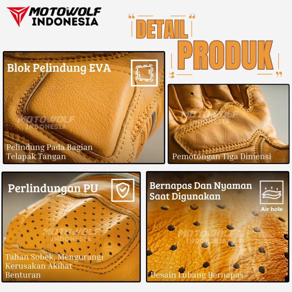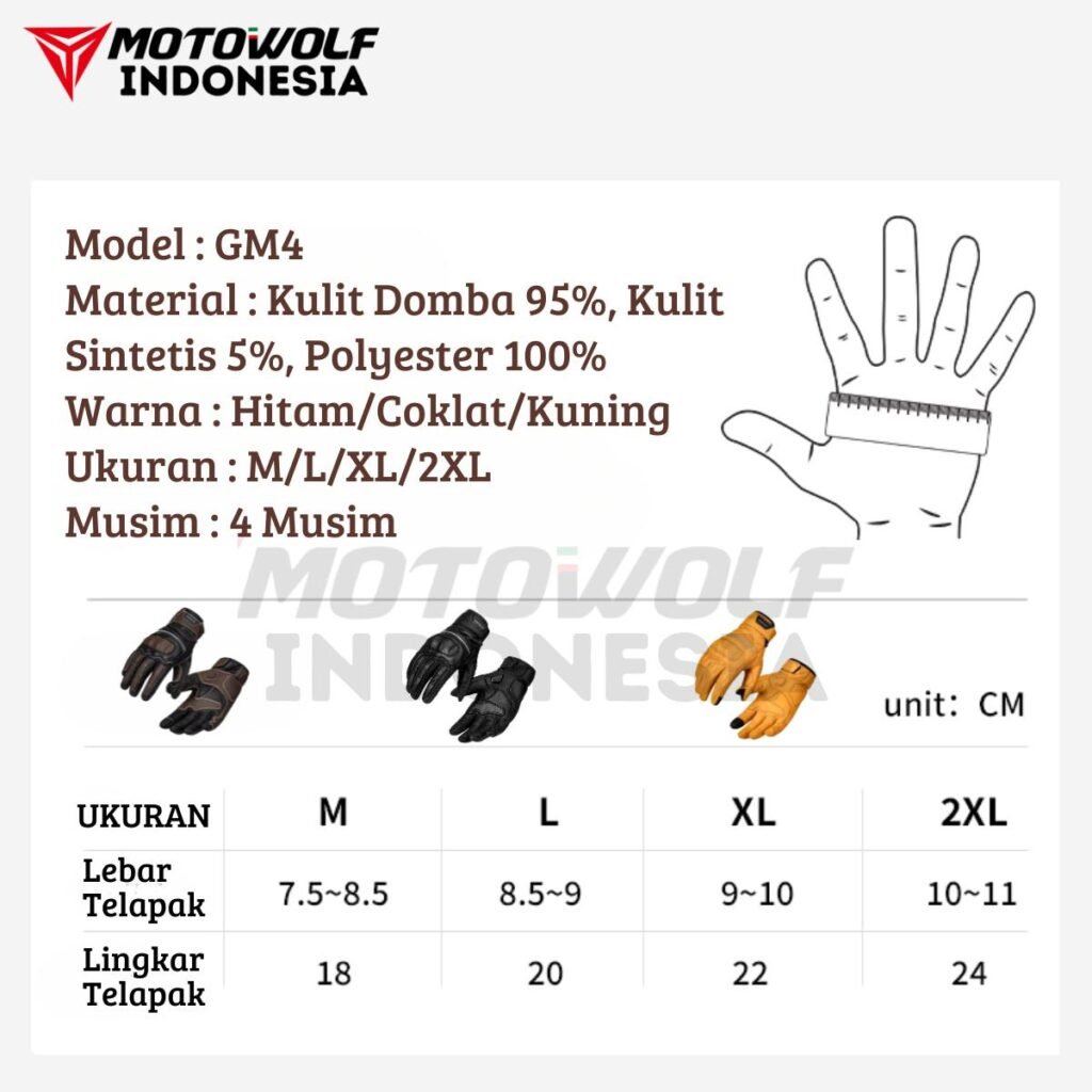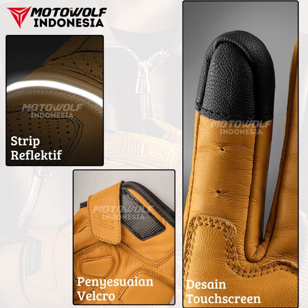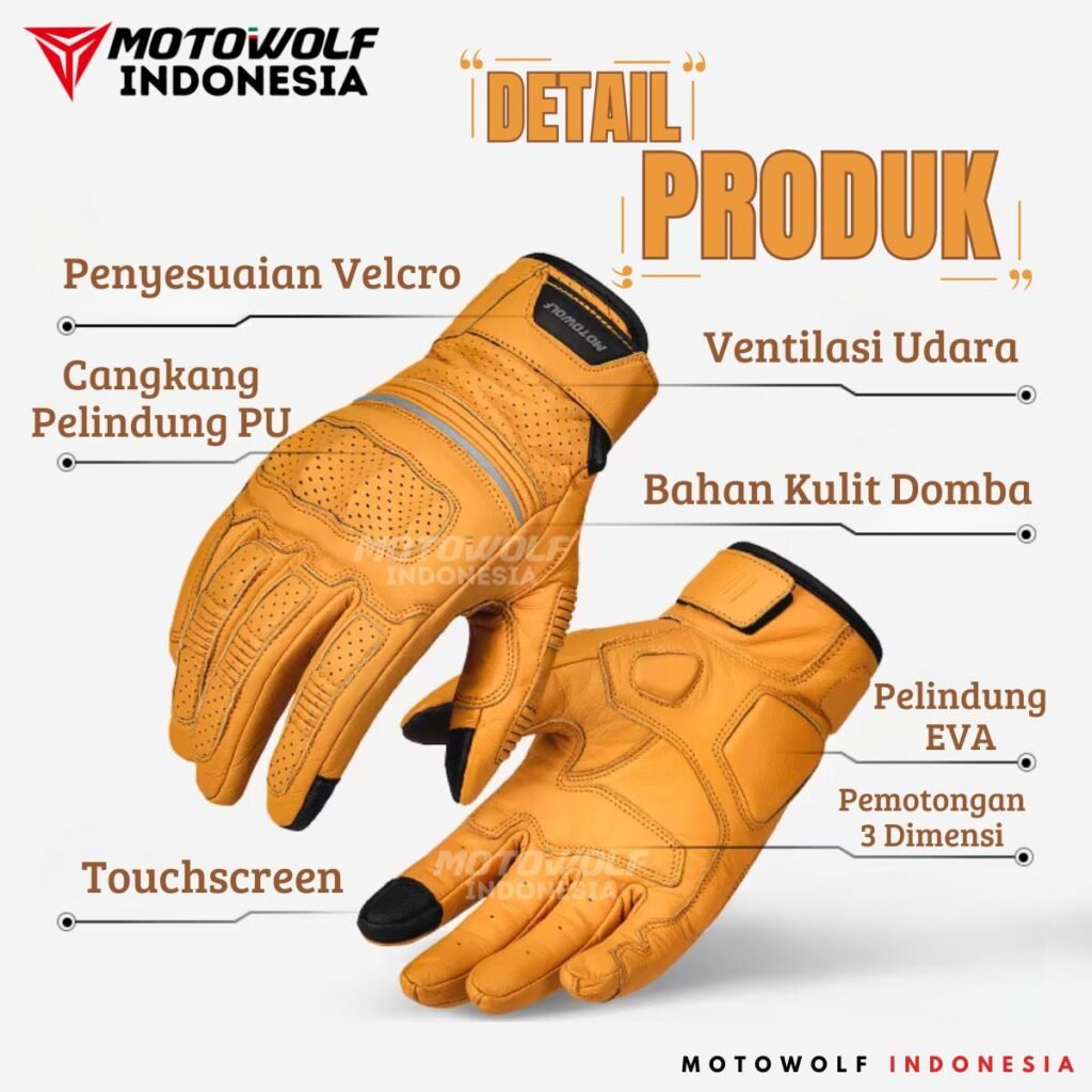 Fitur : Bahan Kulit Domba, Cangkang Pelindung PU, Bantalan EVA Pada Telapak, Touchscreen, Desain Berventilasi, Anti Slip, Penyesuian Velcro.