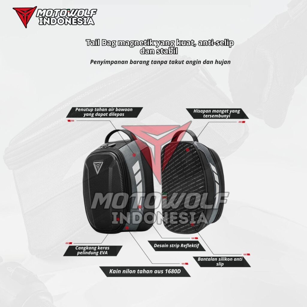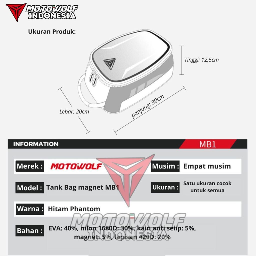 Bahan kualitas premium yang Tebal, dan berkualitas serta brand motowolf yang berkelas internasional. Selain itu, Tank bag motowolf ini dapat di jinjing.