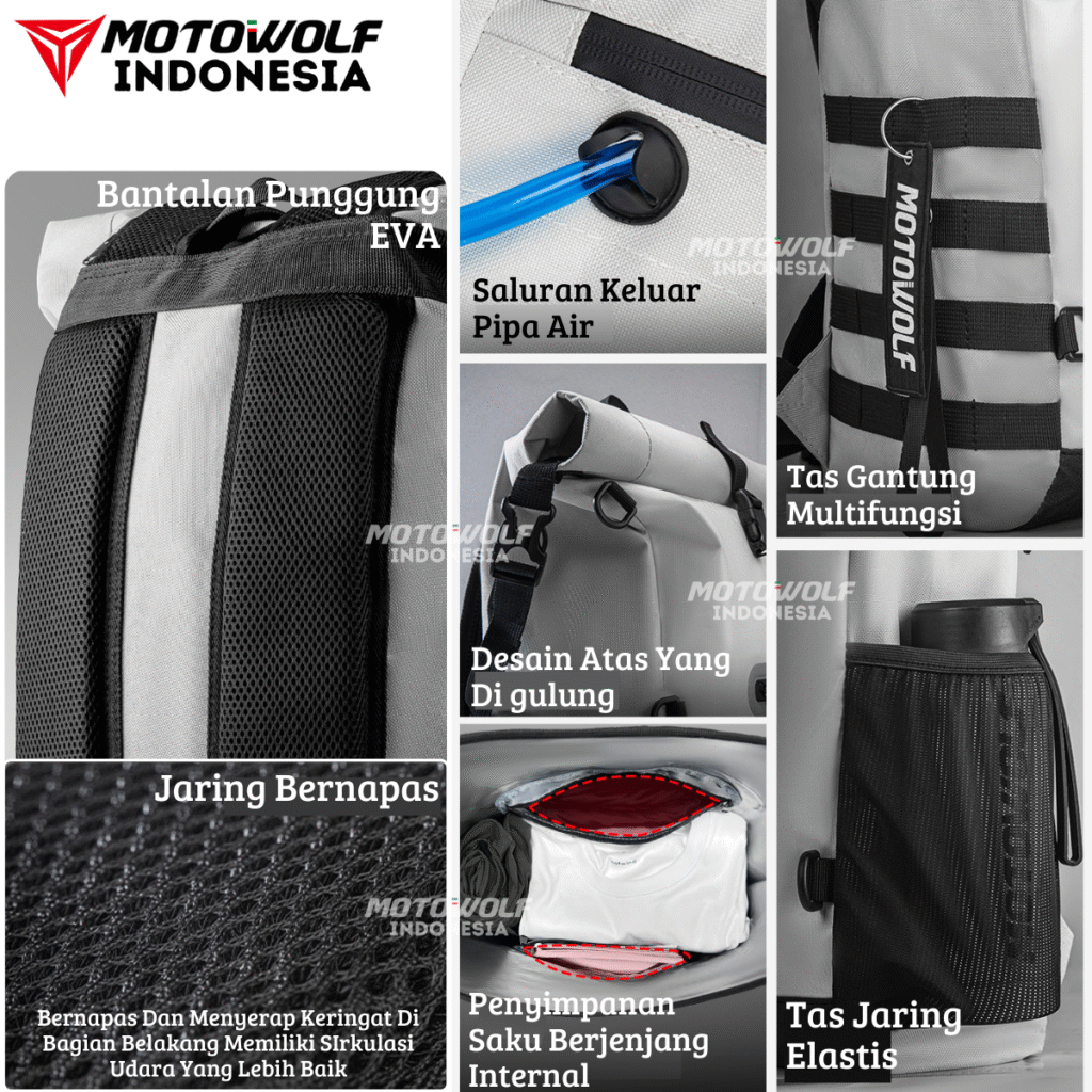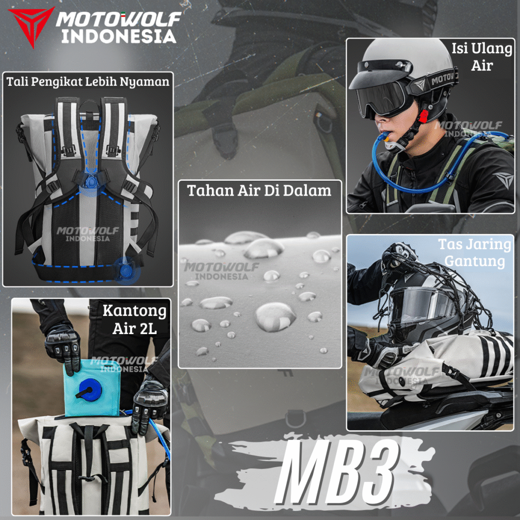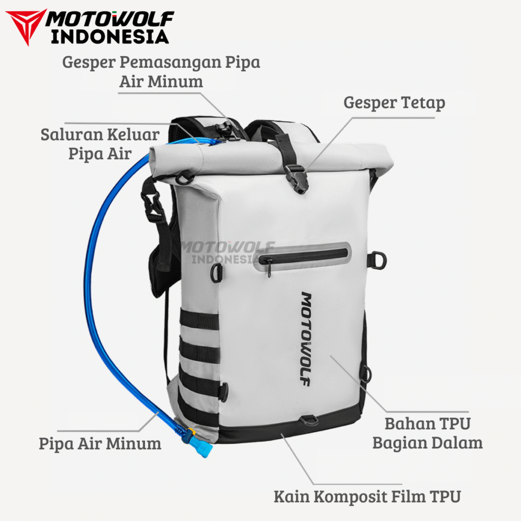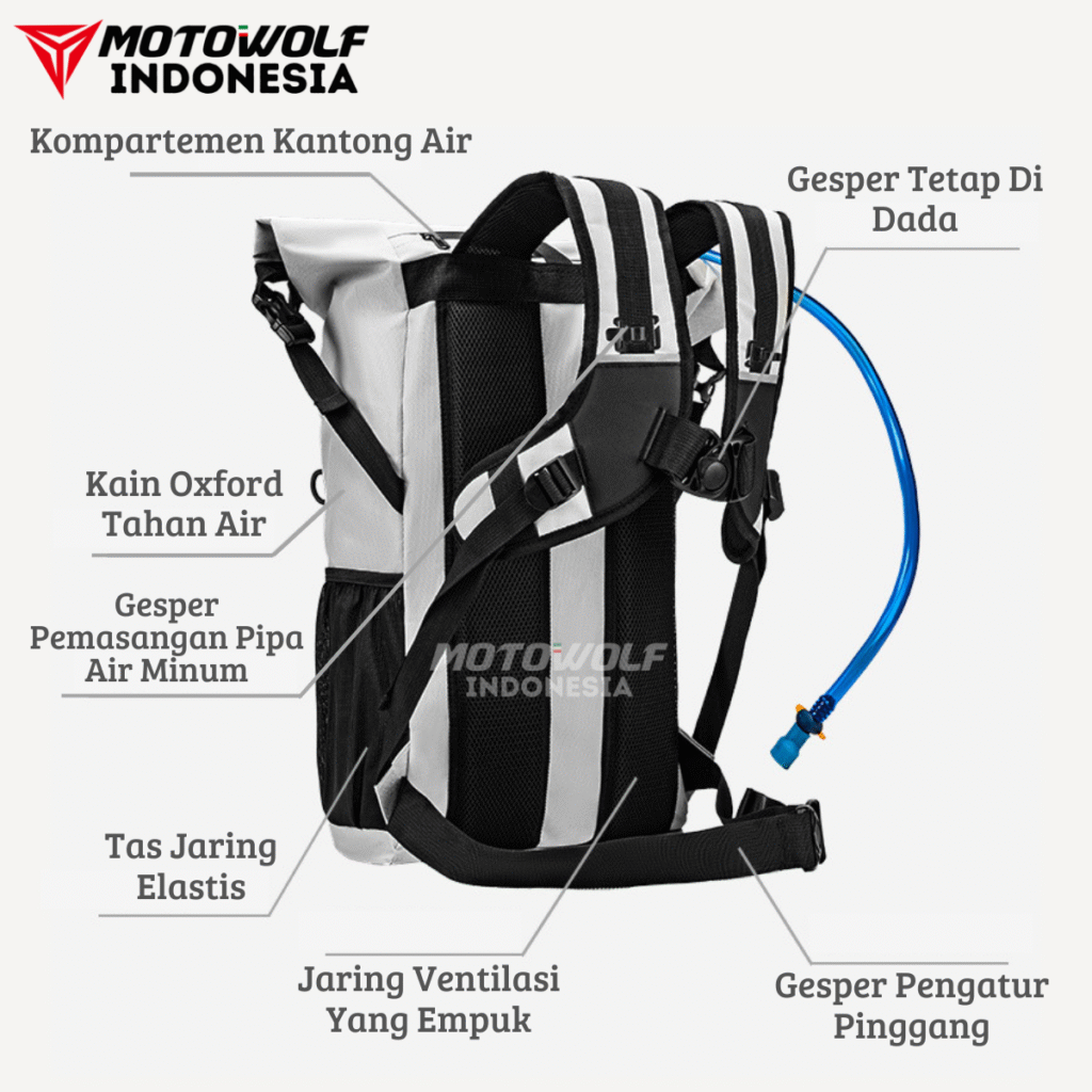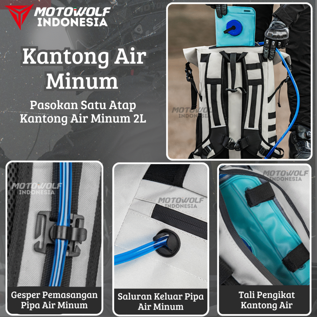 Backpack ini sudah dilengkapi fitur tahan air yang membuat tas ini aman digunakan saat berkendara pada musim hujan, pada bagian dalam tas sudah terdapat kantong air yang berkapasitas 2L.