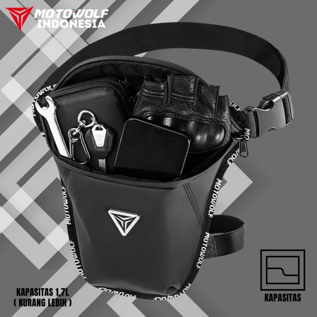 Fitur : Ruang luas dengan kapasitas 1,7L, Quick release, Dapat di setel tinggi posisi ikatan paha, dapat di selempang.