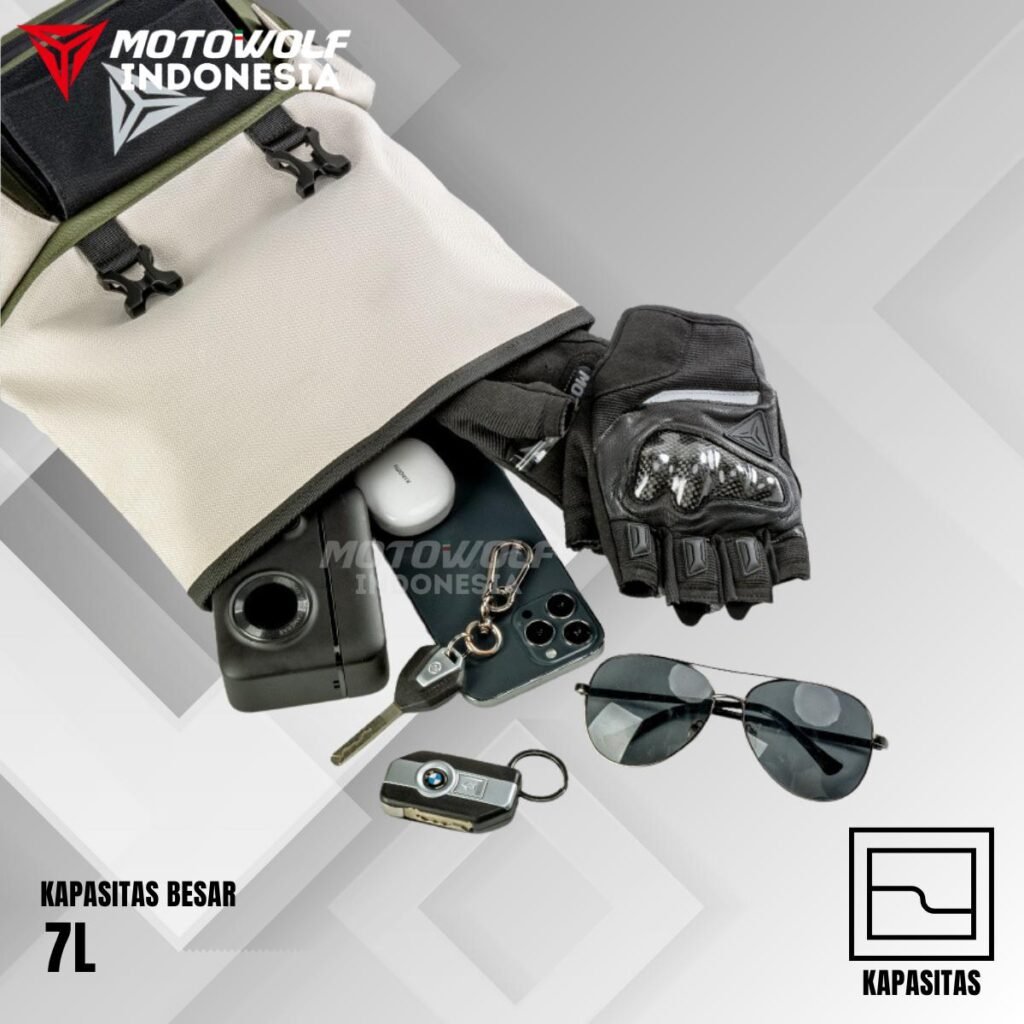 Tas pinggang ini cocok digunakan untuk membawa barang-barang kecil saat berkendara dengan motor sport atau motor matic dengan kapasitas yang besar.
